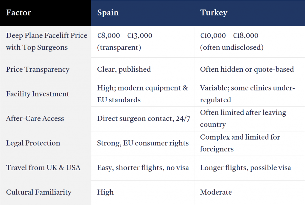 While Turkey remains a popular option, the era when it offered dramatically cheaper surgery is coming to an end — especially for procedures performed by top surgeons. For British & USA patients who value safety, communication, and accountability, Spain has become the smarter and more reassuring choice.
